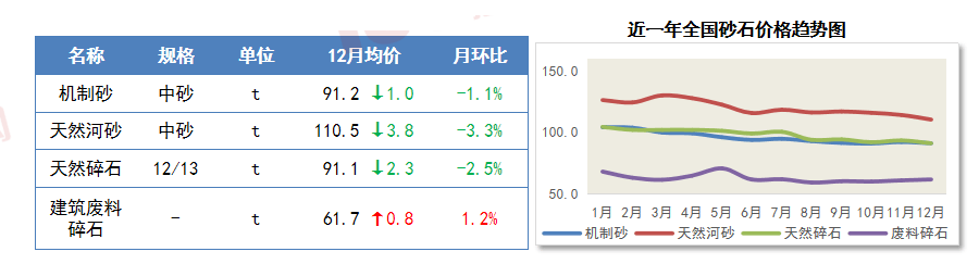 12月除建筑废料碎石外,其余三种材料全国均价均有下滑,砂石行业整体面临“产能过高、需求疲软、竞争激烈”的严峻挑战。