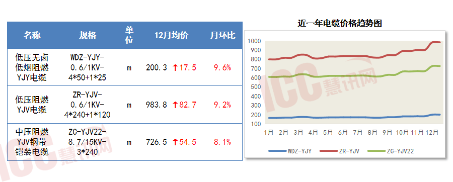 2025年全国三款电缆均价较2024年实现全面上涨,WDZ-YJY、ZR-YJV、ZC-YJV22同比涨幅分别为6.3%、7.7%、4.5%。全年走势呈震荡上行、年末加速冲刺特征,12月涨势尤为迅猛,三类产品环比涨幅分别达9.6%、9.2%、8.1%,均价同步刷新全年峰值。