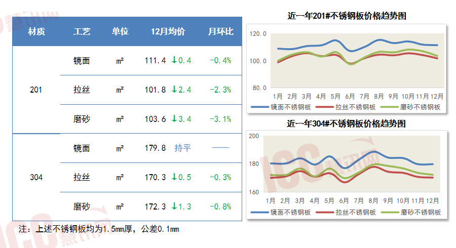 2025年1-12月不锈钢板价格先抑后扬再回落,上半年波动上涨,6月集体触底后持续回升,9月起转入下行通道,年末趋弱收尾。整体上,年末价格较年初均有不同程度抬升。