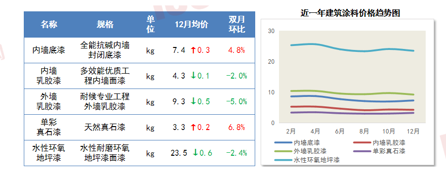 2025年建筑涂料全品类价格呈先稳后降再分化的态势。11-12月内墙底漆、单彩线%,内墙、外墙乳胶漆、水性环氧地坪漆环比小幅下跌2.0%-5.0%。