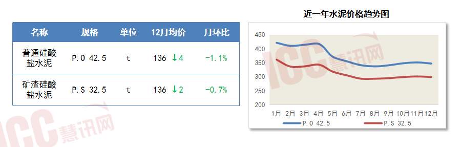 12月份,年底工程项目赶工需求旺盛,但原料砂石、水泥支撑乏力,商品混凝土价格环比小幅下跌。