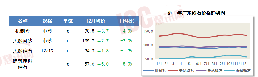 12月广东砂石价格弱势运行,具体来看,机制中砂环比下滑4.0%,河砂中砂均价环比下滑2.0%,天然碎石全省均价环比下跌1.9%,建筑废料碎石均价回落至58元/吨。